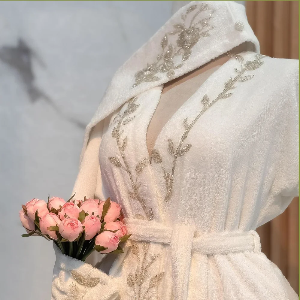 روب حمام عرايسي فاخر يجمع بين الأناقة والراحة، مصنوع من قماش البامبو الناعم المعروف بنعومته الفائقة وقدرته العالية على الامتصاص. يتميز بلون أبيض نقي مع خياطة مزينة بخرز فضي أنيق يضفي لمسة راقية ومميزة. يأتي الروب مع منشفة شعر متناسقة ليمنح تجربة متكاملة بعد الاستحمام، مما يجعله خيارًا مثاليًا للعروس أو كهدية فاخرة.